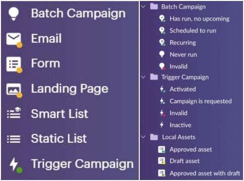 The icons and badges for assets have an updated look. Here’s a breakdown of each icon in a handy visual from the Marketo community – thank you Marketo! I’ve also included a visual of the different icons for each asset type currently available.